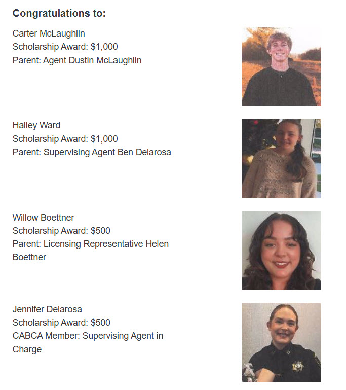 California Alcoholic Beverage Control Agents (CABCA) is proud to announce scholarship awards to four students, three of them a CABCA member’s child, and fourth a CABCA member.