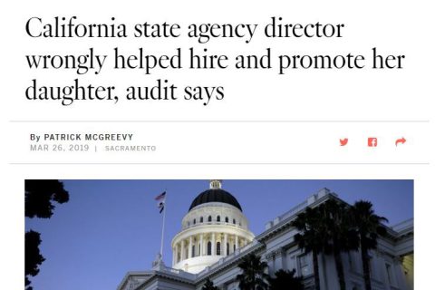 Excerpt – A former state government administrator allegedly engaged in “gross misconduct” by using the influence of her position to circumvent California’s civil service employment process in hiring and promoting her daughter, according to a state auditor’s report sent Tuesday to Gov. Gavin Newsom. The full article can be read here: https://www.latimes.com/politics/la-pol-ca-california-government-director-nepotism-audit-20190326-story.html